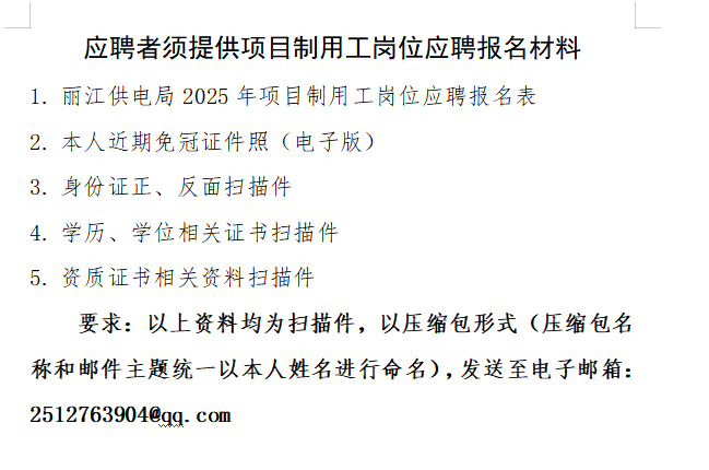 應聘者須按照附件3《提交材料清單》提供項目制用工崗位應聘報名材料,填寫附件2《麗江供電局2025年項目制用工崗位應聘報名表》,并附本人近期免冠證件照、身份證、畢業(yè)證、資格證書等相關材料掃描文件,以壓縮包形式(壓縮包名稱和郵件主題統(tǒng)一以本人姓名進行命名),發(fā)送至電子郵箱:2512763904@qq.com。