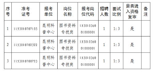 昆明市科學(xué)技術(shù)協(xié)會(huì)所屬事業(yè)單位 2025年公開(kāi)招聘工作人員進(jìn)入資格復(fù)審人員名單如下: