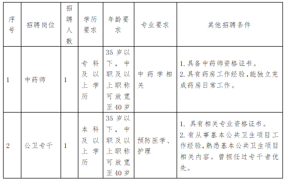 此次面向社會公開招聘中藥師1名,公衛(wèi)專干1人,共計2人。