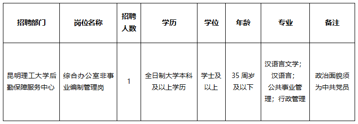 昆明理工大學后勤保障服務中心因工作需要,現(xiàn)面向社會公開招聘非事業(yè)編制管理崗位工作人員1名,現(xiàn)將有關招聘事宜公告如下: