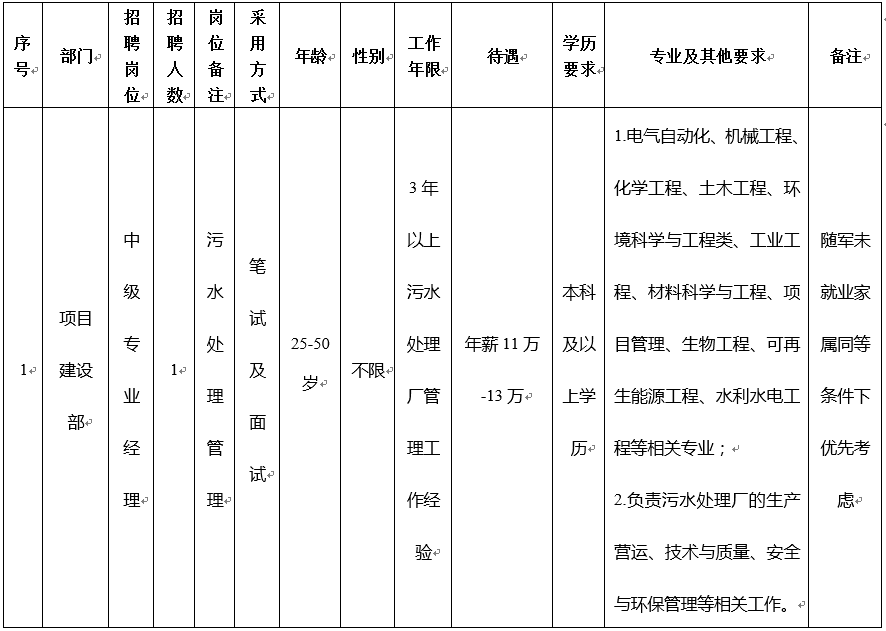 硯山金池實業(yè)有限責任公司為硯山七鄉(xiāng)產(chǎn)業(yè)投資集團有限公司的國有獨資公司,公司成立于2018年7月6日,注冊資本金5000萬元。業(yè)務范圍涵蓋:輸電、供電、受電電力設施的安裝、維修和試驗;發(fā)電業(yè)務、輸電業(yè)務、供(配)電業(yè)務;供電業(yè)務;燃氣經(jīng)營;生物質燃氣生產(chǎn)和供應;燃氣汽車加氣經(jīng)營;城市建筑垃圾處置(清運);城市生活垃圾經(jīng)營性服務;污水處理及其再生利用等。為滿足公司運營需求,特向社會公開招聘1名污水處理廠副廠長。