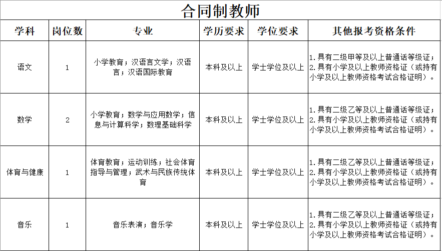 2.專業(yè)要求:所學(xué)專業(yè)與招考專業(yè)相符,具有小學(xué)教師資格證及以上(或相應(yīng)教師資格考試合格證)和普通話證書(二級(jí)乙等及以上)