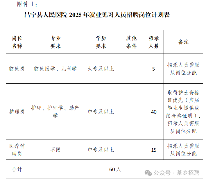 招聘就業(yè)見習(xí)崗60人,其中包括:臨床崗5人、護(hù)理崗40人、醫(yī)療輔助崗15人。招聘的具體崗位、資格條件等詳見《昌寧縣人民醫(yī)院2025年就業(yè)見習(xí)人員招聘崗位計(jì)劃表》(附件1)