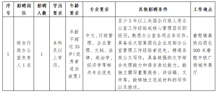 為進(jìn)一步滿足云南磨憨站城城市開發(fā)有限公司工作開展需要,按照公開、平等、競爭、擇優(yōu)的原則,由云南磨憨站城城市開發(fā)有限公司委托我公司面向社會(huì)公開招聘綜合行政辦公室負(fù)責(zé)人1名,現(xiàn)將招聘信息公告如下: