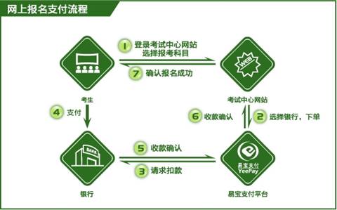 2、網(wǎng)上預(yù)報名后,請您登陸繳費頁面,選擇易寶支付提供的支付方式進行繳費。繳費流程圖如下: