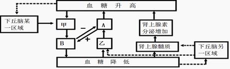 (2)糖尿病患者主要是圖中甲 細胞受損,使 分泌不足, 發(fā)生障礙,使細胞內(nèi)能量供應不足,導致脂肪蛋白質(zhì)分解加強。所以病人出現(xiàn)機體逐漸消瘦,體重減輕的癥狀。