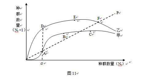(2)圖11中甲、乙兩條曲線分別表示濕地中兩種生物當年的種群數(shù)量(Nt)和一年后的種群數(shù)量(Nt+1)中間的關系,直線P表示Nt+1=Nt。甲曲線上A、B、C三點中,表示種群數(shù)量增長的是 點;乙曲線上D、E、F三點中,表示種群數(shù)量相對穩(wěn)定的是 點;Nt小于a時,甲、乙兩條曲線中 曲線所代表的生物更易消亡。