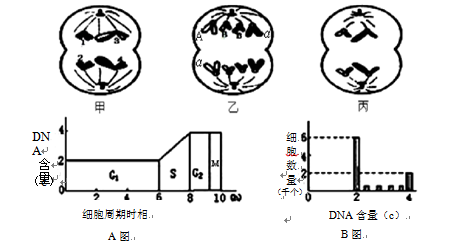 27.如圖8所示,甲、乙、丙是某個二倍體動物的幾個細胞分裂示意圖(數(shù)字代表染色體,字母代表染色體上帶有的基因),A圖表示一個細胞周期中的細胞核內(nèi)DNA含量的變化曲線;B圖表示處于一個細胞周期中各個時期細胞數(shù)目變化(用特殊方法在一個培養(yǎng)基中測得的),請據(jù)圖回答(1)~(4)。