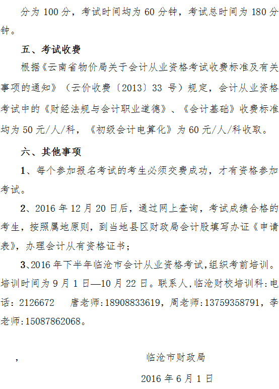 臨滄市2016年下半年會計從業(yè)資格考試報名公告