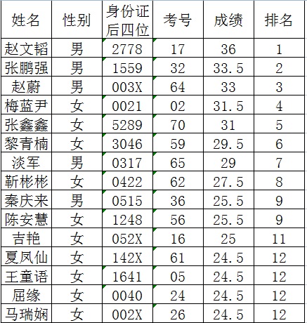 根據(jù)筆試成績(jī)從高分到低分的順序按招聘人數(shù)1:3的比例確定15名考生進(jìn)入面試(筆試成績(jī)并列的,均進(jìn)入面試),名單如下: