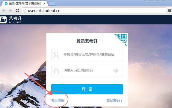 報名系統(tǒng)網(wǎng)址為http://www.artstudent.cn。登錄界面如圖1-1所示,若未進入登錄界面,點擊“登錄”按鈕即可進入。對于初次使用系統(tǒng)的考生,需進行“考生注冊”。