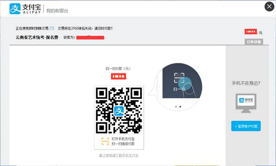 提交成功后進入“專業(yè)交費”頁面,點擊“支付”按鈕,系統(tǒng)會打開支付寶支付頁面,考生在支付寶平臺交費成功后,調(diào)回到“藝考報名交費平臺”后會顯示“支付成功”。