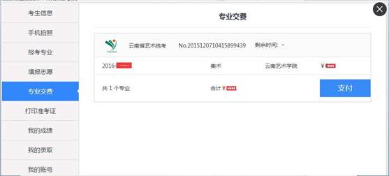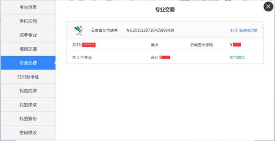 支付成功后,請考生按招生簡章規(guī)定時間登入本系統(tǒng)打印準(zhǔn)考證,并到相關(guān)考點確認(rèn)考試安排,憑《專業(yè)準(zhǔn)考證》參加專業(yè)考試。