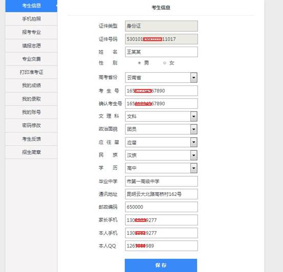 登錄成功后,系統(tǒng)會自動轉(zhuǎn)到基本信息填寫界面,考生需要如實填寫自己的基本信息,填寫完畢后保存信息。如圖4-1所示: