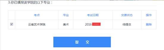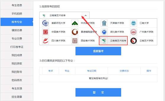 2.非統(tǒng)考(云南藝術(shù)學(xué)院??迹┻x擇“云南藝術(shù)學(xué)院”。第二步選擇“考點”:省統(tǒng)考和非統(tǒng)考均選擇“云南藝