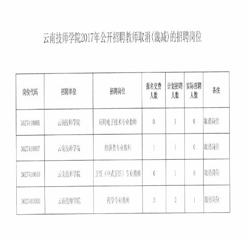 云南技師學(xué)院2017年招聘教師取消或裁減部分招聘崗位公告