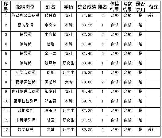 根據(jù)中共曲靖市委組織部 曲靖市人力資源和社會保障局《關(guān)于印發(fā)〈曲靖市事業(yè)單位公開招聘人員試行辦法〉的通知》(曲人社〔2011〕55號)及《曲靖醫(yī)學(xué)高等??茖W(xué)校2017年公開招聘編制外工作人員公告》規(guī)定,現(xiàn)將曲靖醫(yī)專2017年公開招聘招聘編制外工作人員體檢、考察結(jié)果及擬錄(聘)用人員名單公示如下(公示期為7個工作日):