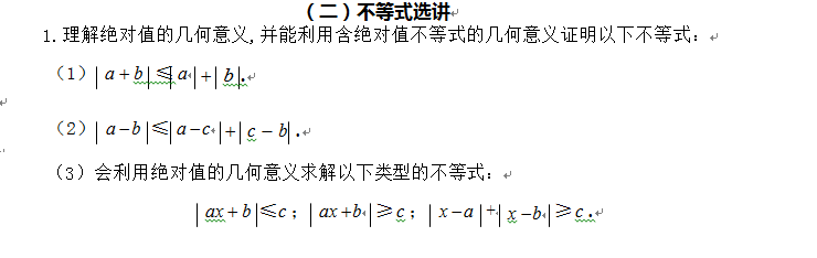 本部分包括必考內容和選考內容兩部分.必考內容為《課程標準》的必修內容和選修系 列 1 的內容;選考內容為《課程標準》的選修系列 4 的“坐標系與參數方程”、“不等式選講”等 2 個專題.