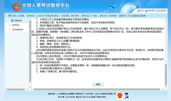 通過點擊“接受”按鈕,進入查看考生承諾書的頁面,如下圖所示: