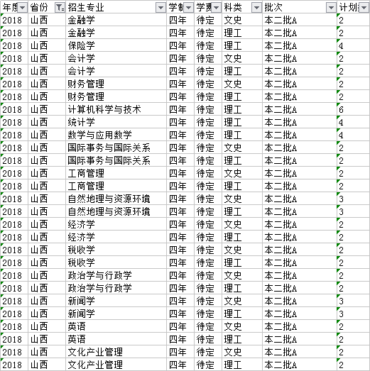 云南財經大學2018年本科分省招生計劃表(山西省)