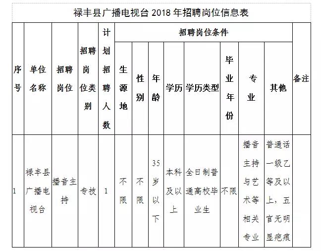 為進(jìn)一步加強(qiáng)祿豐縣廣電人才隊(duì)伍建設(shè),改善人才隊(duì)伍結(jié)構(gòu),提高服務(wù)能力,促進(jìn)廣電事業(yè)的可持續(xù)發(fā)展,經(jīng)中共祿豐縣委宣傳部研究決定,現(xiàn)面向社會(huì)公開招聘播音主持1名,現(xiàn)將招聘有關(guān)事宜公告如下: