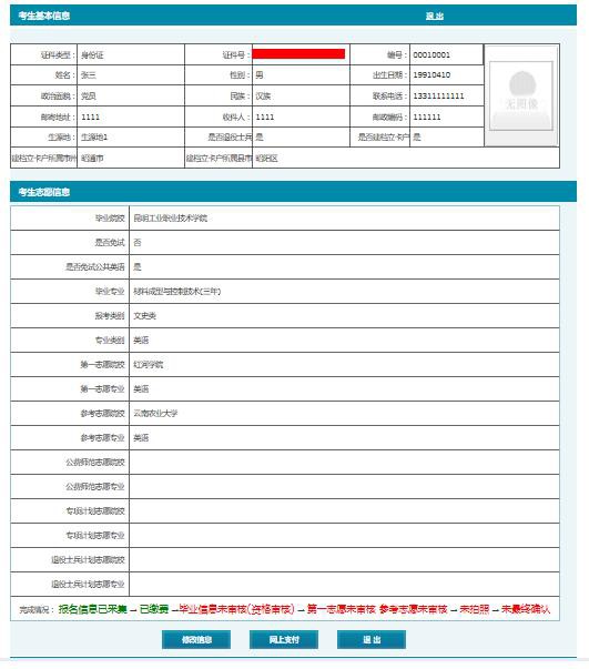 6、點(diǎn)擊【返回】按鈕,返回報(bào)名信息展示頁面,如需更改信息,點(diǎn)擊【修改信 息】按鈕,如無誤后及時(shí)退出系統(tǒng)。