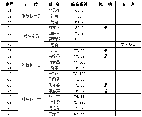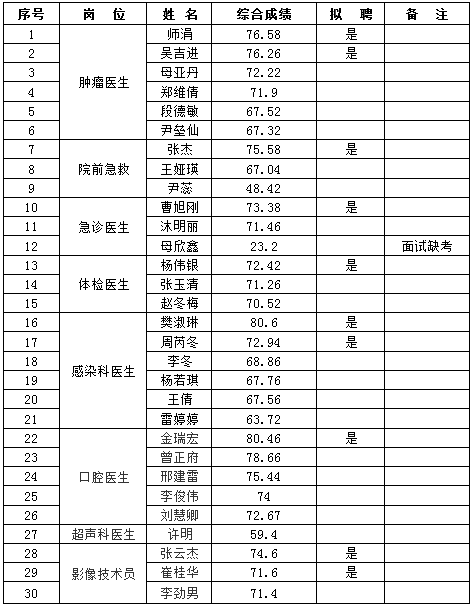 根據(jù)《云南昆鋼醫(yī)院2019年工作人員(非事業(yè)編制)招聘啟事》的相關(guān)安排,經(jīng)過現(xiàn)場報名、資格審查、筆試、面試、體檢等程序,經(jīng)醫(yī)院招聘人員工作領(lǐng)導(dǎo)小組辦公室審批,現(xiàn)將綜合成績和擬聘名單公示如下: